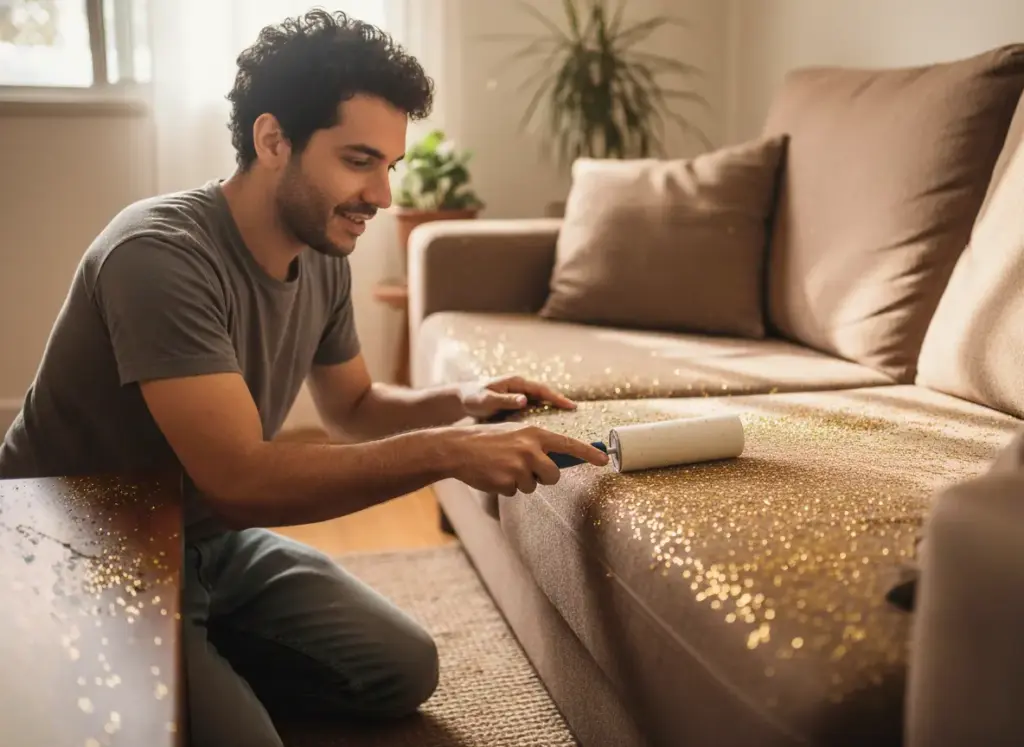 - Blindagem contra o glitter: este é o tipo de convidado que insiste em não ir embora. Para domá-lo, tenha rolos adesivos à mão para remover o brilho da pele e dos tecidos. Já para o chão, prefira mops secos ou panos de microfibra, que atraem as partículas por eletricidade estática em vez de espalhá-las.