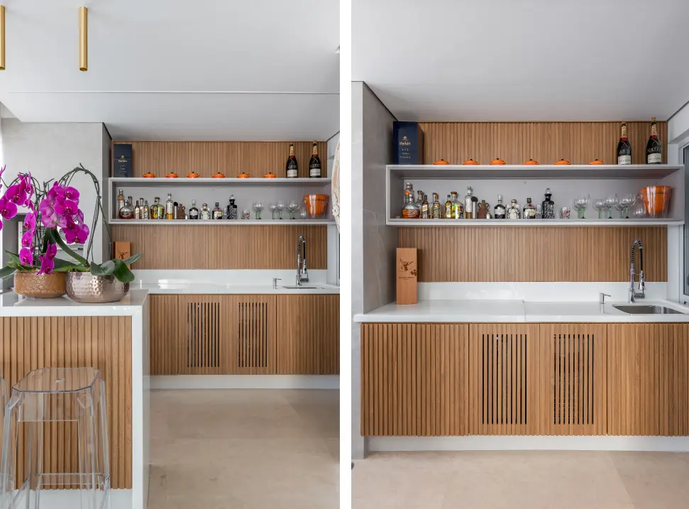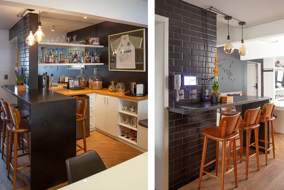 Em apartamentos com cozinha aberta, o bar pode ser uma transição fluida entre os ambientes. Nesse sentido, aproveita-se a própria estrutura da bancada para ganhar funcionalidade sem ocupar espaço extra. Uma dica da arquiteta é estender a bancada de granito da cozinha para criar o bar. “Na parte superior, as prateleiras com fundo espelhado trazem sofisticação e dão sensação de amplitude à área social”, descreve Cristiane.
