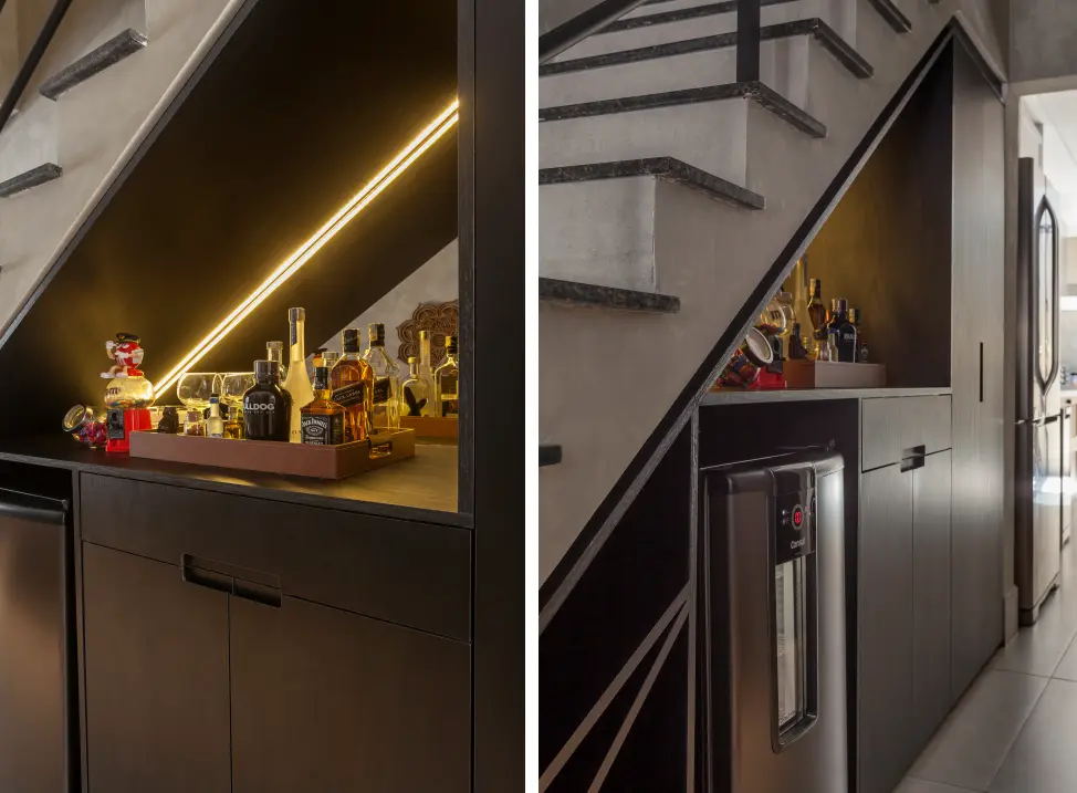 Muitas pessoas acreditam que morar em um apartamento compacto impede a criação de uma área de lazer, mas a arquiteta desmistifica essa ideia. Pelo contrário, o segredo está na otimização de cada centímetro. “Em metragens reduzidas, a marcenaria sob medida é a nossa maior aliada para acomodar uma cervejeira e armários para copos, integrando o cantinho de bebidas diretamente à sala de jantar de forma funcional”, revela.