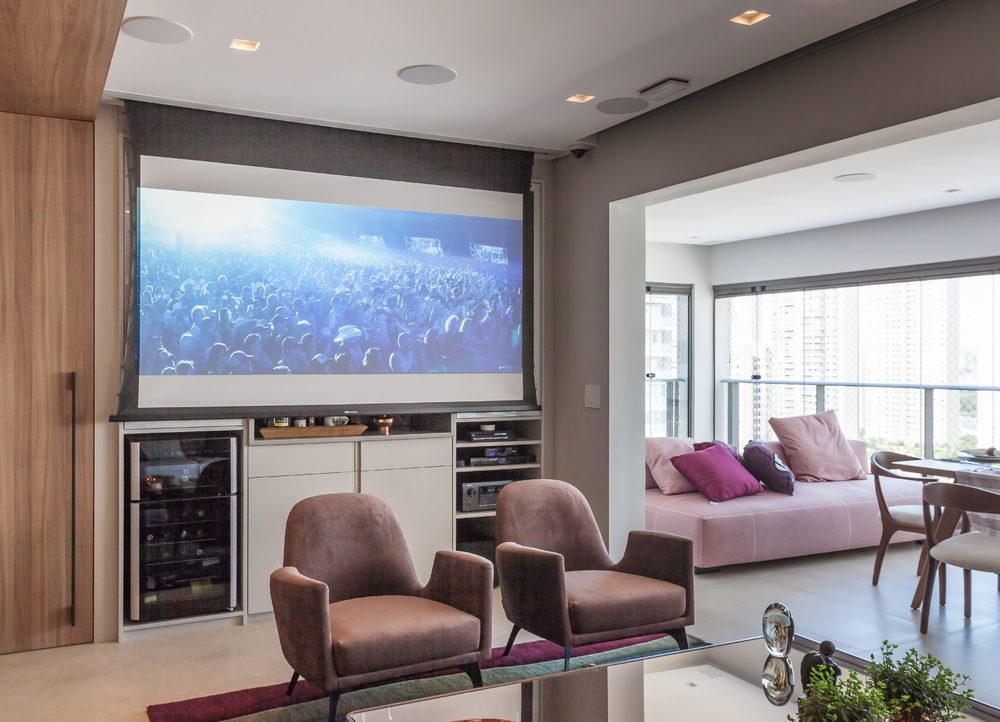 Unir o prazer de um drinque com o cinema em casa é uma tendência forte para quem ama maratonar séries. Em áreas sociais integradas, o espaço pode servir como uma ante sala sofisticada. Assim, é importante combinar o projeto com um som e projetor. Dessa forma, o bar posicionado próximo à mesa de jantar também pode acomodar os equipamentos de áudio e vídeo, unificando as funções de lazer no mesmo móvel.